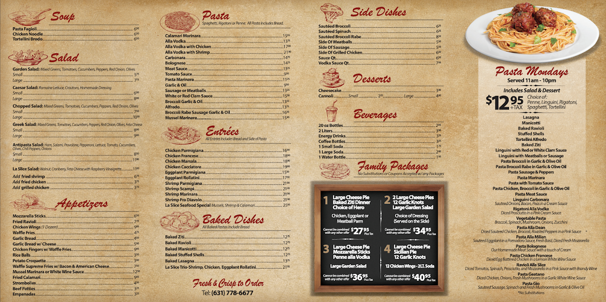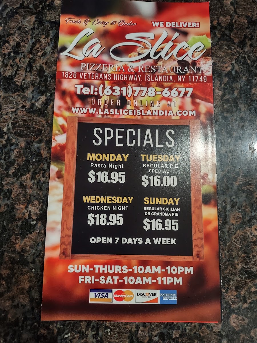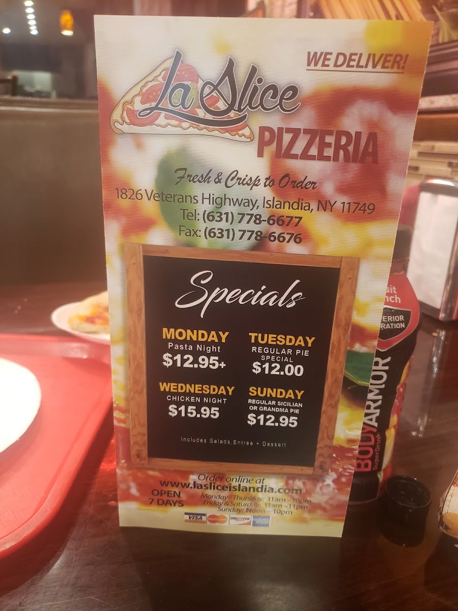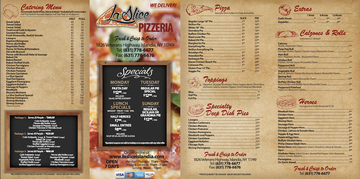 If you’re craving delicious pizza and comfort food, La Slice Pizzeria Menu offers something for everyone. Nestled in Islandia, NY, this cozy spot has been serving up fresh, mouthwatering pies, pasta, and all your favorite Italian dishes. Whether you're in the mood for a classic Margherita pizza with perfectly melted mozzarella or a more adventurous slice with unique toppings, you'll find it here. For those looking for something beyond pizza, the menu includes a range of hearty pasta options, crisp salads, and savory sides to round out your meal. Located at 1826 Veterans Memorial Hwy, it’s the perfect place to grab a bite with friends or family. So next time you're in the area, swing by and indulge in a flavorful meal that’s sure to satisfy your cravings!